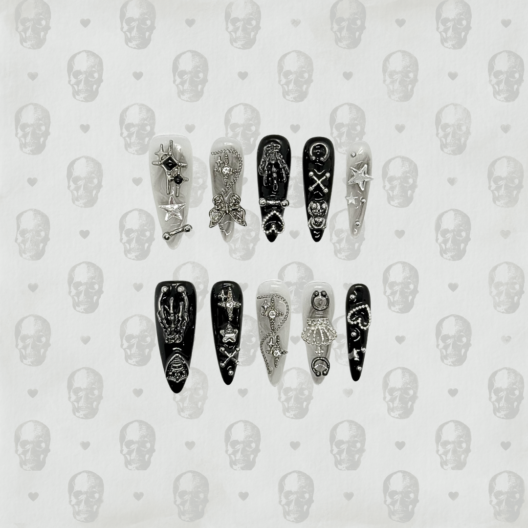 Rebel Soul is a fearless press-on nail set made for those who love to stand out. With bold black and silver tones, skull charms, and grunge-inspired flair, this design is unapologetically cool. Perfect for concerts, streetwear looks, or your inner rockstar, Rebel Soul nails scream attitude with style.
