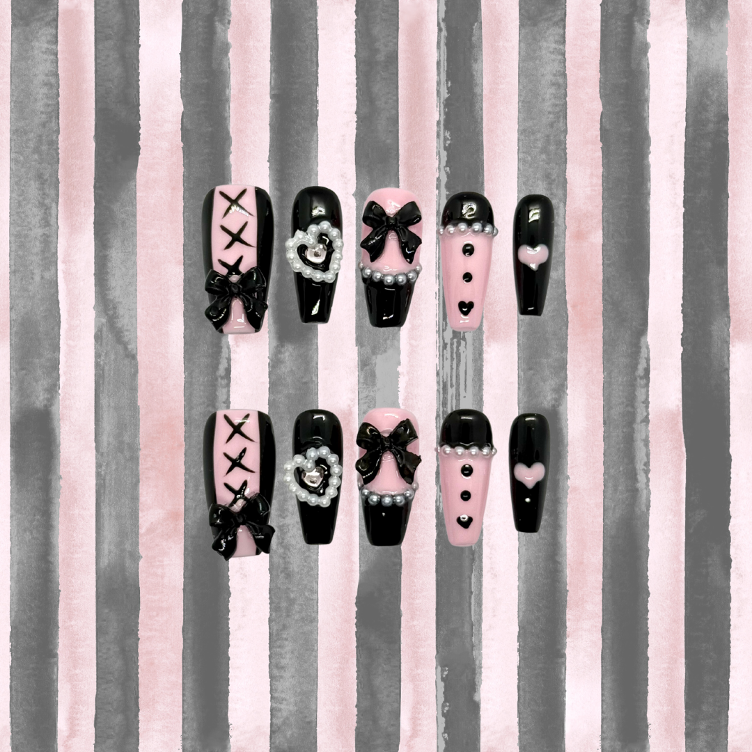 School Rebel is a chic press-on nail set that mixes sweet details with a rebellious twist. Featuring bold black and pink tones accented with dainty bows, tiny pearls, and heart motifs, this design is equal parts cute and daring. Perfect for showing off your playful side with a touch of attitude, School Rebel is the go-to set for days you want your nails to feel fun, flirty, and unapologetically bold.