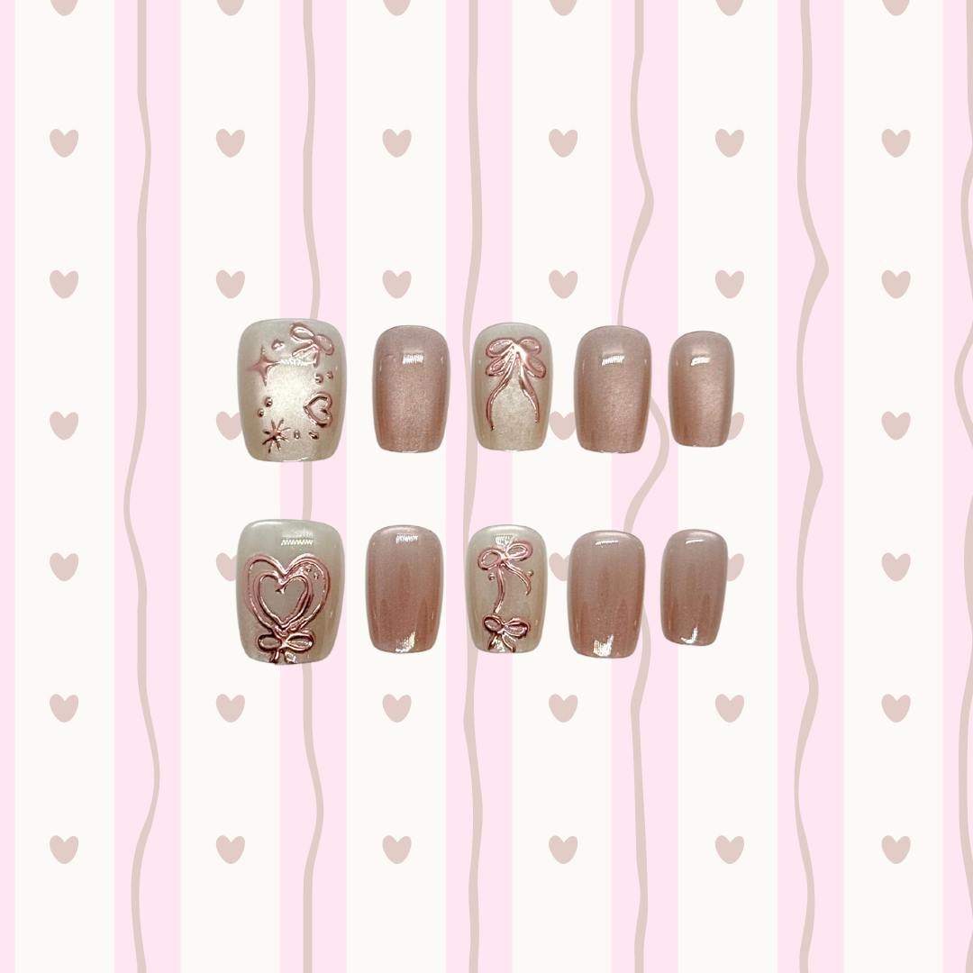 Sweet Serene is a simple yet elegant press-on nail set that radiates calm beauty. With soft pastel beige-pink tones, a glossy finish, and subtle heart details, this design is perfect for those who love clean, feminine styles with a touch of sweetness. Effortlessly timeless and easy to pair with any look, Sweet Serene brings gentle charm and quiet confidence to your fingertips.