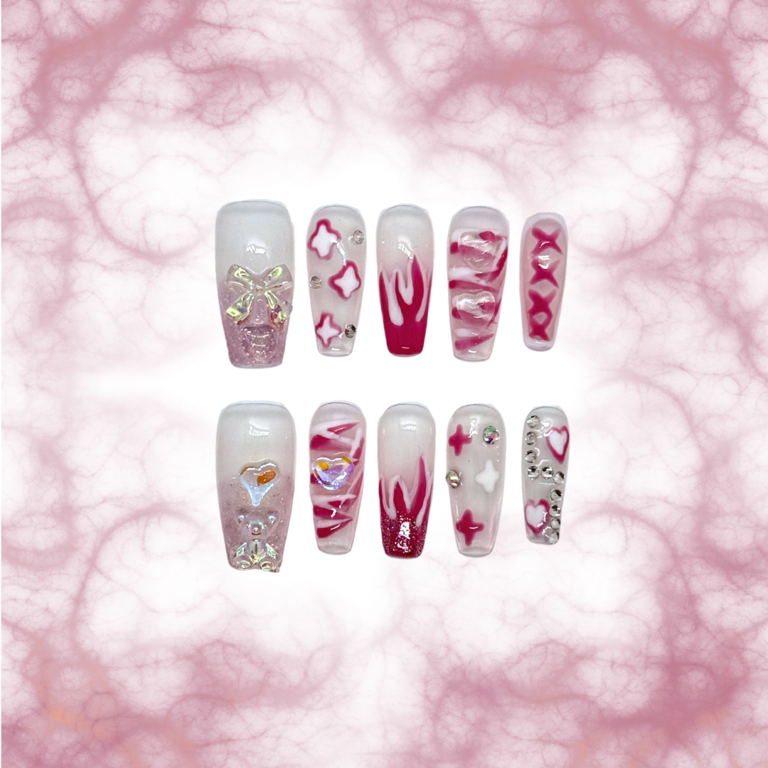 Baby Pop is for the soft girls who still love a little drama. Featuring blush pink gradients, star accents, glossy swirls, and subtle gems, this set gives off sweet-but-bold energy. Perfect for days you want your nails to feel playful, flirty, and effortlessly cute.