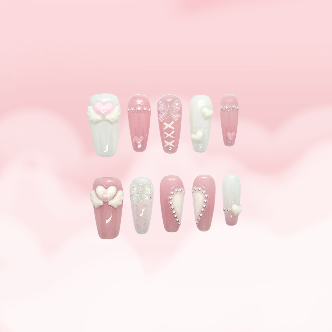 Angel Kiss is a sweet and whimsical press-on nail set made to feel heavenly. With soft pink and white tones, dainty heart details, and delicate angel wings, this design captures pure charm and innocence. Perfect for romantic dates, special occasions, or simply adding a touch of magic to your everyday look, Angel Kiss makes your nails look as soft and dreamy as its name.