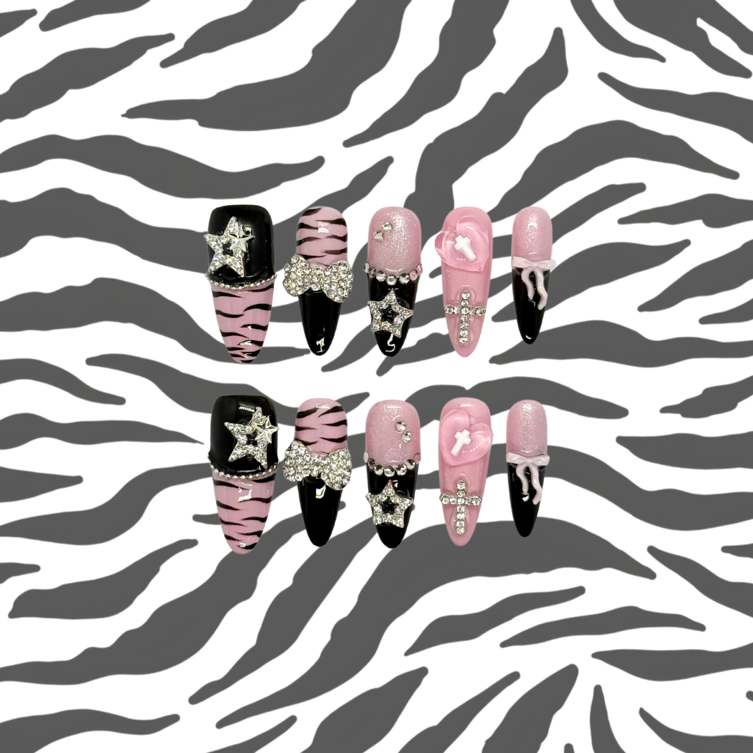 Wild Glam is a bold press-on nail set that turns every look into a statement. With striking black and pink tones, edgy zebra patterns, and star, bow, and cross charm details, this design is all about mixing wild energy with glamorous flair. Perfect for nights out, concerts, or anytime you want your nails to steal the spotlight, Wild Glam is playful, fearless, and unapologetically chic.