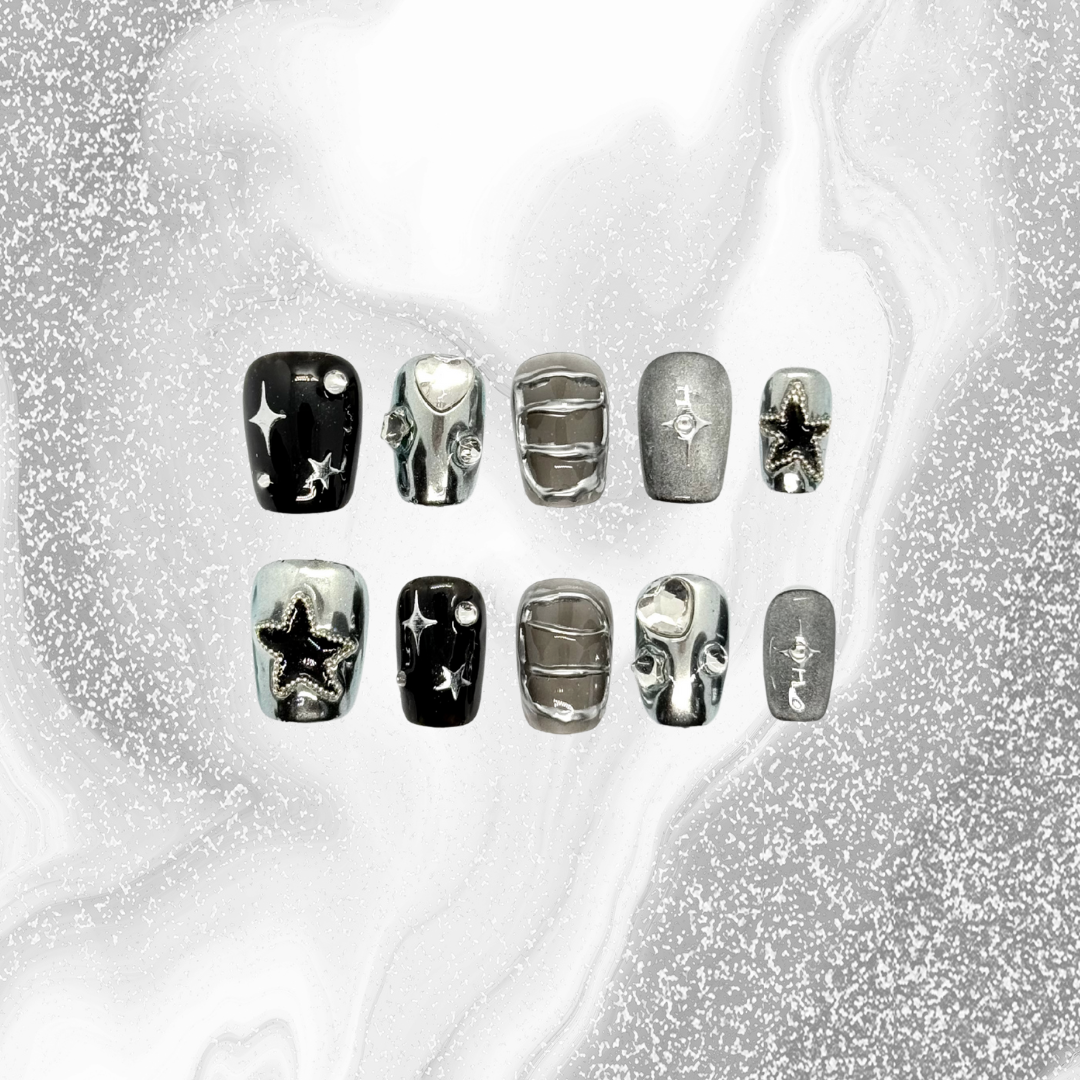 Cosmic Edge is a bold press-on nail set inspired by the mystery of the night sky. Featuring deep black tones with shimmering silver accents and star details, this design captures a cosmic, futuristic vibe. Perfect for nights out, concerts, or anytime you want to channel your inner star power, Cosmic Edge adds a striking, celestial touch to your look.