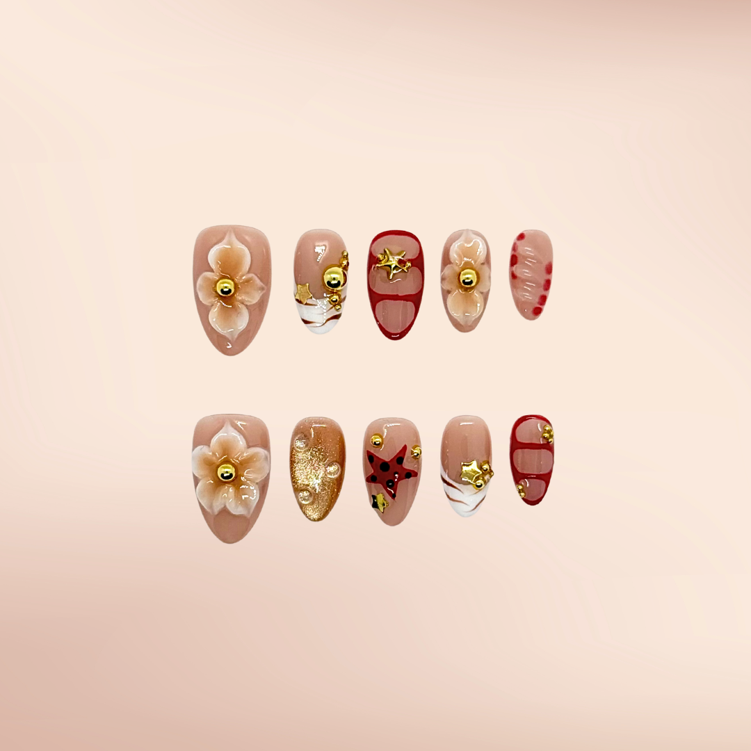 A soft nude base with delicate 3D florals, gold stars, and shimmery details — Golden Bloom is your go-to for something dreamy and festive. It’s feminine, romantic, and golden-hour ready.